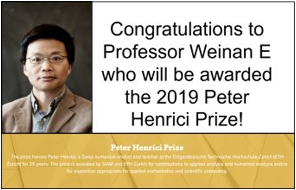 美国时间2018年12月6日,鄂维南院士获得2019年度由SIAM和ETH Zürich联合授予的 Peter Henrici奖。用以表彰鄂维南教授在应用数学和科学计算的相关领域的突破性贡献,特别是在非线性随机(偏)微分方程,计算流体动力学,计算化学和机器学习等方面。表彰大会将于2019年7月15日至19日在西班牙巴伦西亚举行。