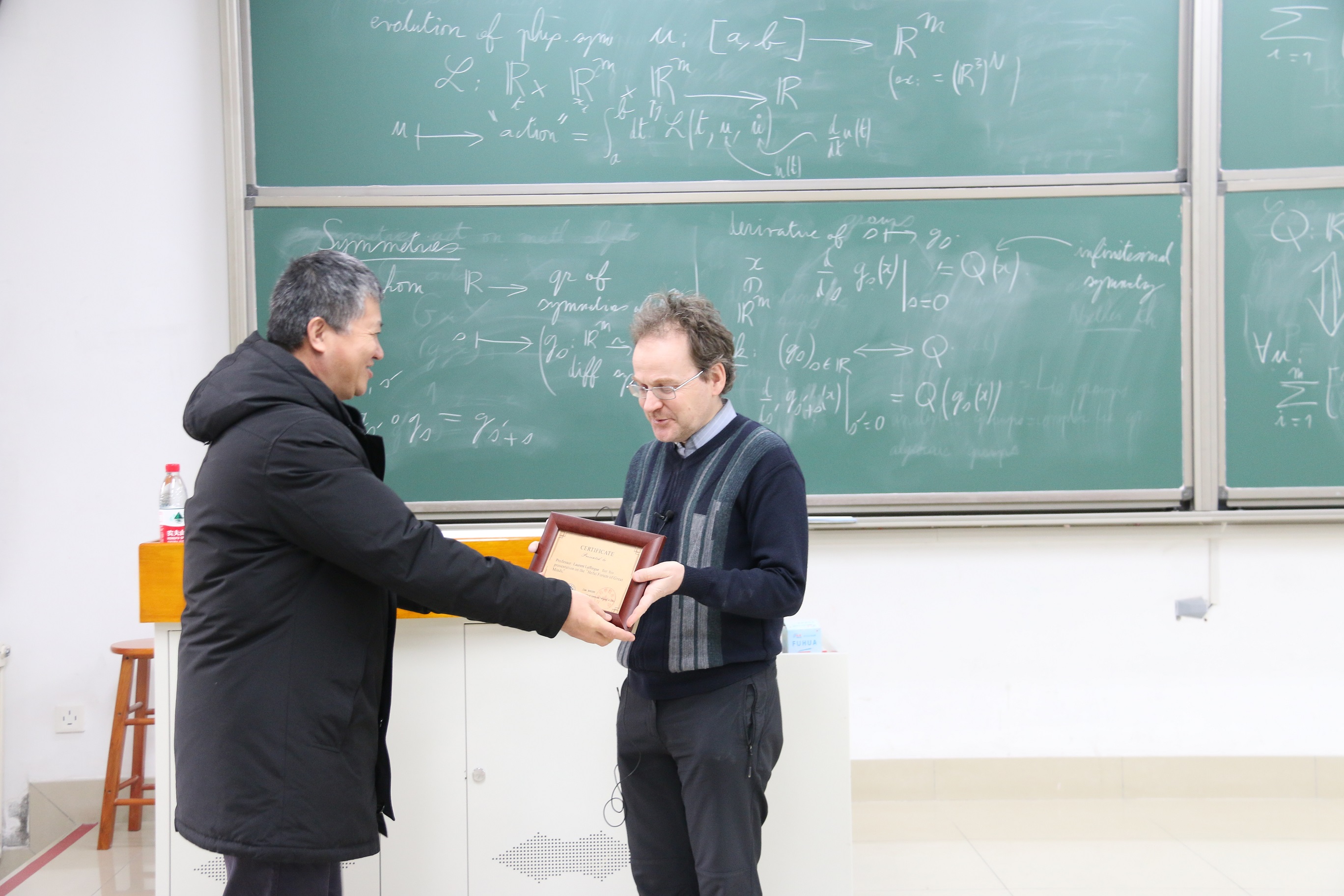 Laurent Lafforgue教授通过呈现两个数学场景来说明这一事实,将数学场景的研究简化为对称性的研究,精彩扎实的分享内容引发了同学们的热烈讨论与积极提问。报告会尾声,李嘉禹教授向Lafforgue教授表示衷心感谢并授予其“合肥大师论坛”纪念证书。