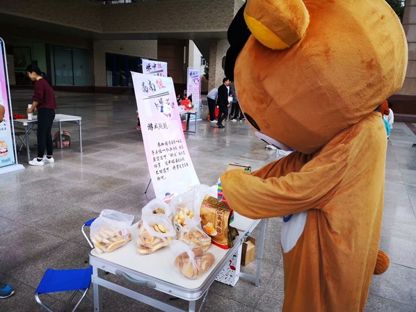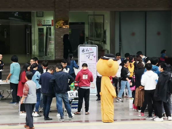 活动开始后,同学们纷纷走向自己感兴趣的摊位。从一开始的探头探脑,询问工作人员游戏玩法和供应食品,到后来的在队伍中焦急等待,翘首踮脚,期盼着游戏快点轮到自己,每一位同学都在活动现场得到了放松与快乐。而在吉祥物——数分熊出场后,现场的气氛更是达到了高潮,很多同学们纷纷走向数分熊想要合影留念,而其他广场上的同学则玩游戏的玩游戏、品美食的品美食,人来人往,好一片热闹非凡的景象。