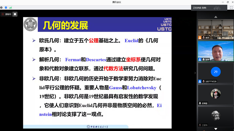 7月20日下午,张希、陈世炳、徐岩、陈小伍、张磊、杨迪、薄立军、黄文、刘利刚、张先得十位教授分别根据学科特色为营员精心准备了线上学术导航讲座并与营员进行了深入的对话和交流。十场讲座各具特色,韵味迥然。张希教授娓娓述说微分几何与方程,徐岩教授深入浅出计算数学,黄文教授如数家珍动力系统,刘利刚教授生动讲解图像处理……“传道授业解惑也”,高端讲座应如是。营员们在讲座中领略数学大师的风范,畅游“数形”知识的海洋。