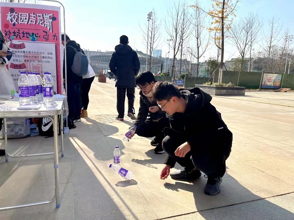 “高到无穷”和“对抗地心引力”也吸引了不少人气。“高到无穷”要求同学们在短时间内把方块叠得尽可能高,而“对抗地心引力”需要同学们向上抛矿泉水瓶使之稳稳落地。这些看似简单的童年游戏似乎早已掩藏在了在我们的记忆深处,然而当我们在学习了物理知识之后,再来重温这些游戏,是否感受到了别样的精彩?重心的偏移,旋转的特性,都在这些游戏中起着重要作用。潘建伟教授曾笑谈“才发现有物理这么简单的学科”,笔者暗自揣度这正是因为物理现象与物理知识就隐藏在我们的日常生活中的缘故吧!