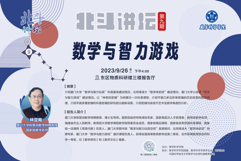 09-26【林亚南】东区物质科研楼三楼报告厅 北斗讲坛 第九期:数学与智力游戏(科普报告)
