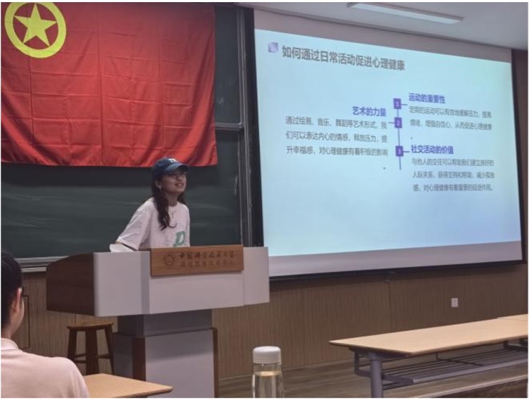 韩子菲同学首先介绍了525心理健康日的由来:这个特殊日子是在提醒大家关注心理健康方面。她提到,心理健康与身体健康同等重要,是人们全面发展的重要基石。接着,她详细阐述了心理测试的必要性与益处,指出心理测试有助于个体更好地了解自己,及时发现并解决潜在的心理问题。在谈及如何促进心理健康时,韩子菲同学提出了多个建议。她认为:保持积极的心态、建立良好的人际关系、培养兴趣爱好等都是促进心理健康的有效途径。此外,她还强调了心理咨询在心理健康维护中的重要作用,鼓励大家在遇到心理困扰时主动寻求帮助,并告诉大家在我校如何进行心理咨询。