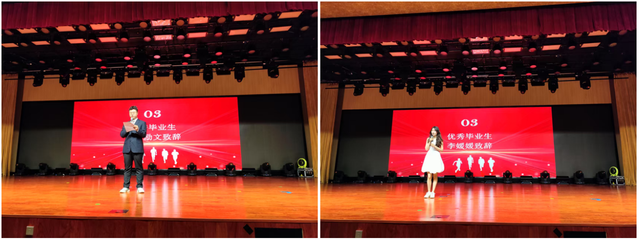 优秀毕业生代表王曹励文、李媛媛也分别上台分享了自己即将毕业的心声,他们结合自己的学习生活经历,鼓励各位毕业生能够继续在自己的人生道路上奋进,并为台下尚未毕业的学弟学妹们送上了宝贵的学习与科研经验。