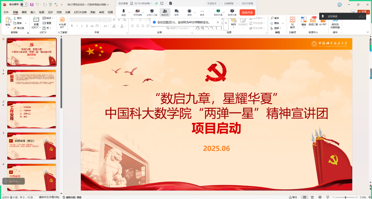 为弘扬“两弹一星”精神,传承老一辈科学家的家国情怀与奉献精神,6月27日晚,“数启九章,星耀华夏”中国科大数乐竞官网“两弹一星”精神宣讲团召开了线上启动会。会议由宣讲团团长沈妍同学主持,指导老师王瑞标及宣讲团11名成员(7名本科生、4名研究生)共同参与。