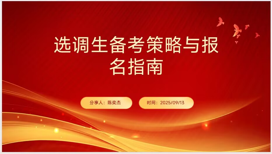 2025年9月13日下午14:00,数学科学乐竞官网研究生会成功举办选调生备考经验线上分享会。本次活动特邀已入职上海市选调的2025届硕士毕业生陈奕杰同学担任主讲嘉宾,吸引了来自不同专业方向的众多同学参与。