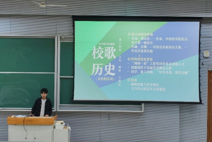 活动伊始,校学生合唱团的同学详细介绍校歌的历史起源和深层涵义。随后,全体新生共学共唱校歌《永恒的东风》。从生疏到熟练,激昂的旋律与“红专并进,理实交融”的校训精神在一次次练习中深入人心。嘹亮的歌声不仅凝聚了集体荣誉感,更激发了同学们作为新“科大人”的自豪与担当。