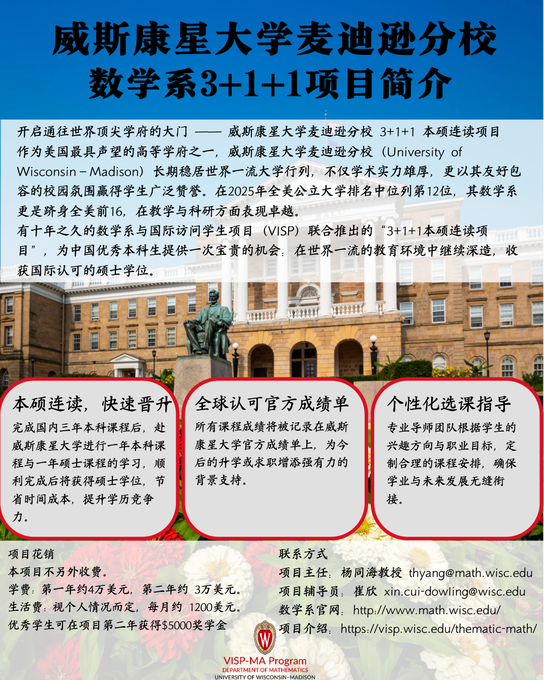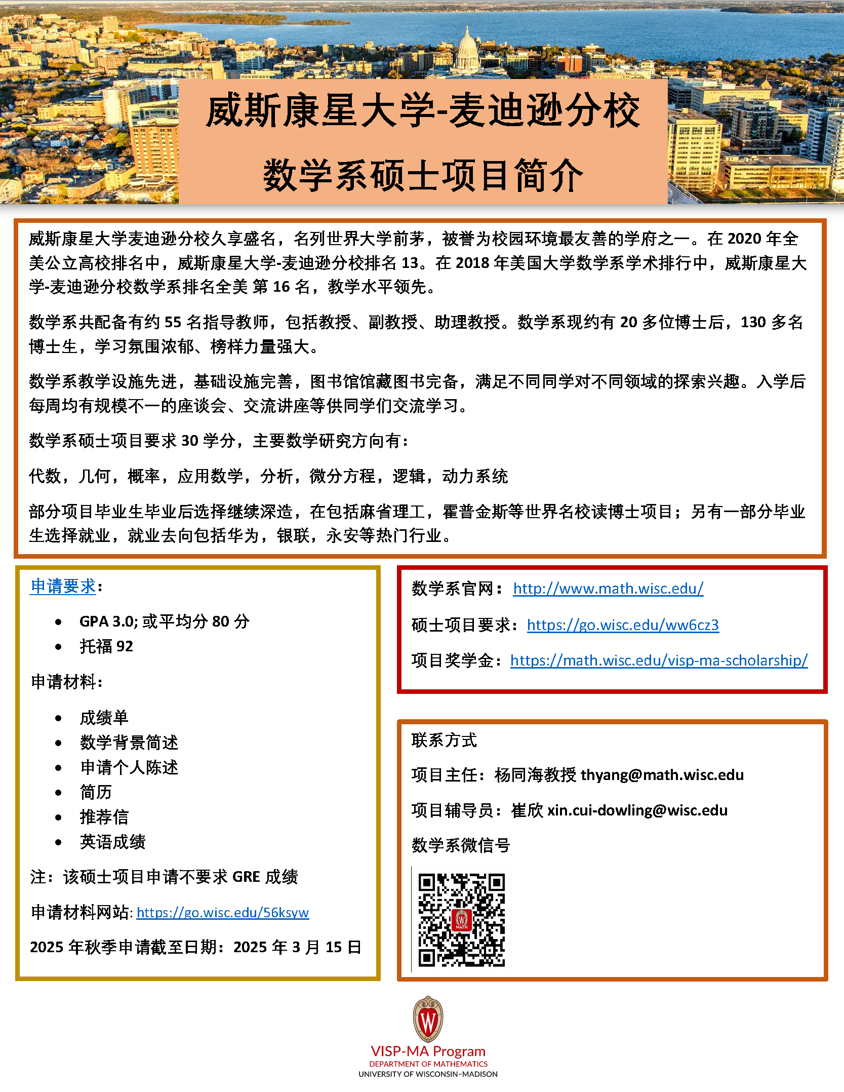 威斯康星大学麦迪逊分校久享盛名,名列世界大学前茅,被誉为校园环境最友善的学府之一。在2020年全美公立高校排名中,威斯康星大学-麦迪逊分校排名13。在2018年美国大学数学系学术排行中,威斯康星大学-麦迪逊分校数学系排名全美第16名,教学水平领先。数学系共配备有约55名指导教师,包括教授、副教授、助理教授。数学系现约有20多位博士后,130多名博士生,学习氛围浓郁、榜样力量强大。数学系教学设施先进,基础设施完善,图书馆馆藏图书完备,满足不同同学对不同领域的探索兴趣。入学后每周均有规模不一的座谈会、交流讲座等供同学们交流学习。数学系硕士项目要求30学分,主要数学研究方向有:代数,几何,概率,应用数学,分析,微分方程,逻辑,动力系统部分项目毕业生毕业后选择继续深造,在包括麻省理工,霍普金斯等世界名校读博士项目;另有一部分毕业生选择就业,就业去向包括华为,银联,永安等热门行业。