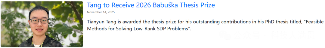 近日,美国数学学会(American Mathematical Society,简称AMS)在其官方网站公布了2026年度Ivo and Renata Babuška Thesis Prize(学位论文奖)的获奖名单,我院2020届校友唐天云凭借其在新加坡国立大学完成的博士论文《Feasible Methods for Solving Low-Rank SDP Problems(求解低秩半定规划问题的可行方法)》荣获该奖项。